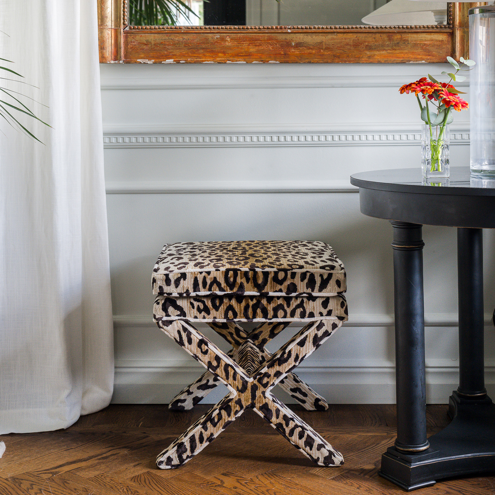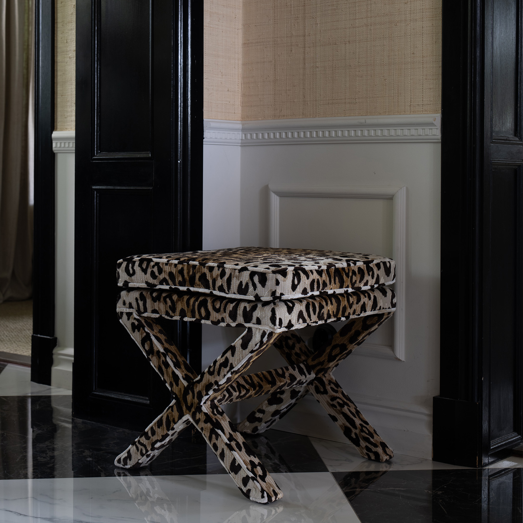 Lou Vanity Stool – Linen Fabric with Velvet Piping & Decorative Tape